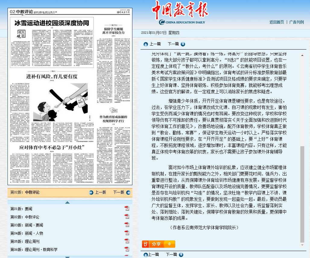 此前,中共中央办公厅、国务院办公厅印发了《关于全面加强和改进新时代学校体育工作的意见》,进一步明确了体育中考的方向,要求进一步扩大体育的分值和影响力。社会上刮起一股“体育课外辅导风”。很多家长在给体育中考点赞的同时,也担心自己孩子拿不到高分,参加课外辅导又会增加经济负担。365官网体育学院院长聂真新教授以《应对体育中考不必急于“开小灶”》为题,在《中国教育报》中教评论版围绕三个方面回应了社会舆论并提出针对性解决方案,对中考体育改革的不断深化具有重要指导意义。