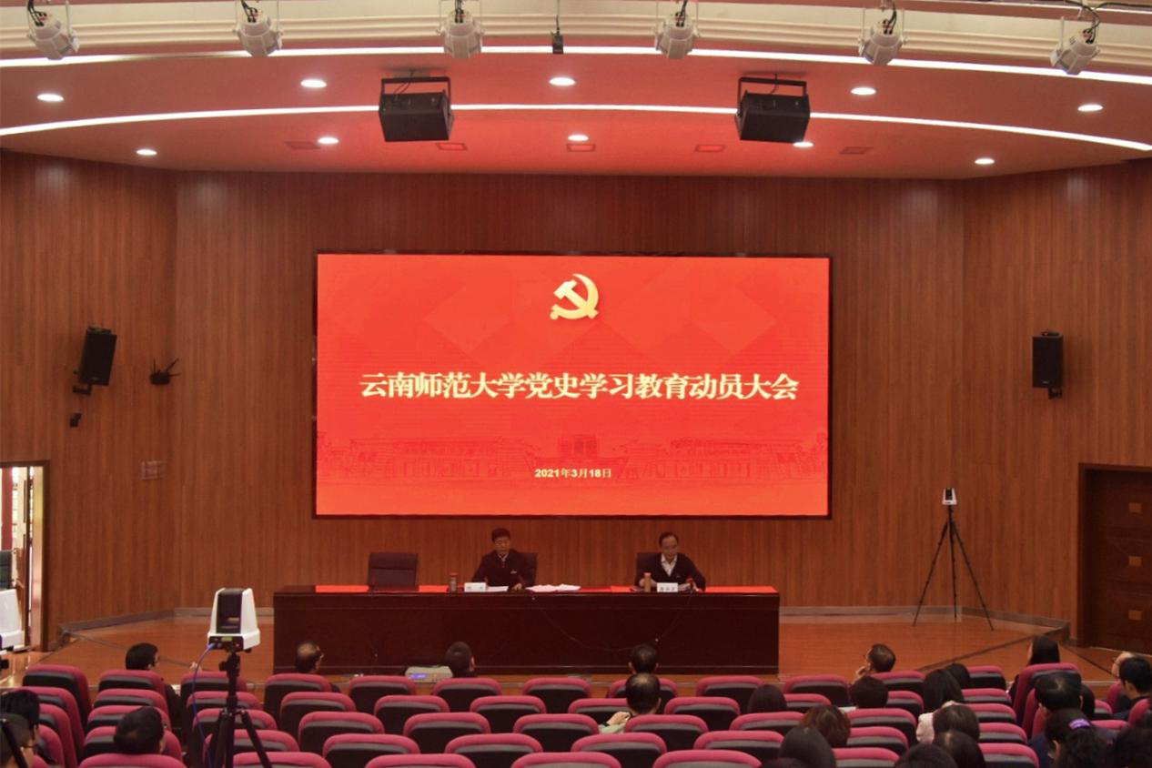 会上,校党委书记饶卫围绕以下三个方面,对全校开展党史学习教育进行了动员部署,提出了明确要求。第一,准确把握党史学习教育的目标要求:一是学史明理,感悟创新理论伟力;二是学史增信,增强“两个维护”自觉;三是学史崇德,坚守立德树人初心;四是要学史力行,开启教育发展新局。第二,准确把握党史学习教育的六个重点:一是深入学习我们党不断推进马克思主义中国化的历史;二是深入学习我们党把握历史发展规律和大势、推动党和国家事业发展的历史主动;三是深入学习我们党始终不渝为人民的初心宗旨;四是深入学习我们党在不同历史时期成功应对风险挑战的宝贵经验;五是深入学习我们党在长期奋斗中铸就的伟大精神;六是深入学习我们党旗帜鲜明讲政治、保证党的团结和集中统一的优良传统。第三,高标准高质量完成党史学习教育各项任务,要突出学党史、悟思想、办实事、开新局,要注重学校特点、教育特色,注重以上率下、上下结合,注重融入日常、抓在经常:一是要坚持正确导向;二是要加强组织领导;三是要把握进度安排;四是要紧密联系实际;五是要创新方式方法;六是要加强督促指导;七是要做好宣传报道。饶书记强调,开展党史学习教育正当其时,意义重大。全体党员、干部要更加紧密地团结在以习近平同志为核心的党中央周围,按照党中央和省委、教育部、省委教育工委的部署安排,把党史学习教育与推进云南教育现代化、办好人民满意的教育结合起来,以实际行动增强“四个意识”、坚定“四个自信”、做到“两个维护”,扎扎实实开展好党史学习教育,确保学校“十四五”开好局、起好步,以优异成绩迎接建党100周年。