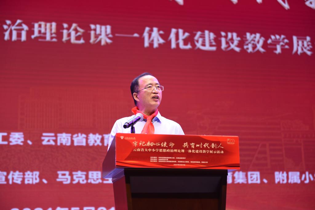 省委教育工委常务副书记杨林代表省委教育工委、省教育厅,对此次教学展示活动的顺利举办表示祝贺,对在思想政治理论课教学和研究中辛勤耕耘、默默奉献的老师们表示崇高的敬意。他指出,近年来,云南省出台深化思政课改革创新13条措施,大力配齐建强思政课教师队伍,积极拓展思政课建设格局,以实施思政课“手拉手”共建计划为重要载体,以集体备课、教学展示为重要途径,推动“大手”拉“小手”,积极探索大中小学思政课一体化建设有效路径。今后,云南省要按照大中小学纵向贯穿、循序渐进和各类课程横向结构合理、功能互补的原则,统筹推进大中小学思政课一体化建设,在“五个一体化”上着力,即教材一体化、教学一体化、教师专业发展一体化、管理一体化、科研一体化。杨林书记表示,思政课改革创新责任重大、意义重大,希望大家共同努力,成功打造云南省思政课改革创新的“升级版”。