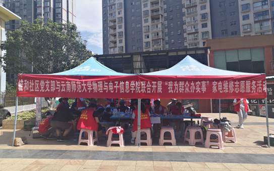 为认真贯彻落实党中央、省委、校党委关于开展党史学习教育的有关要求,更好的推进“双报到双服务双报告”工作 ,发挥党员先锋模范作用,结合学院专业特色,5月23日,物理与电子信息学院联合呈贡区毓和社区党支部,由学院教工党支部、学生第二党支部承办,依托学院梦创电子协会,在雨花毓秀小区开展师生党员“我为群众办实事”家电维修志愿服务。 物理与电子信息学院学生第二党支部全体党员和部分教师党员参加活动。