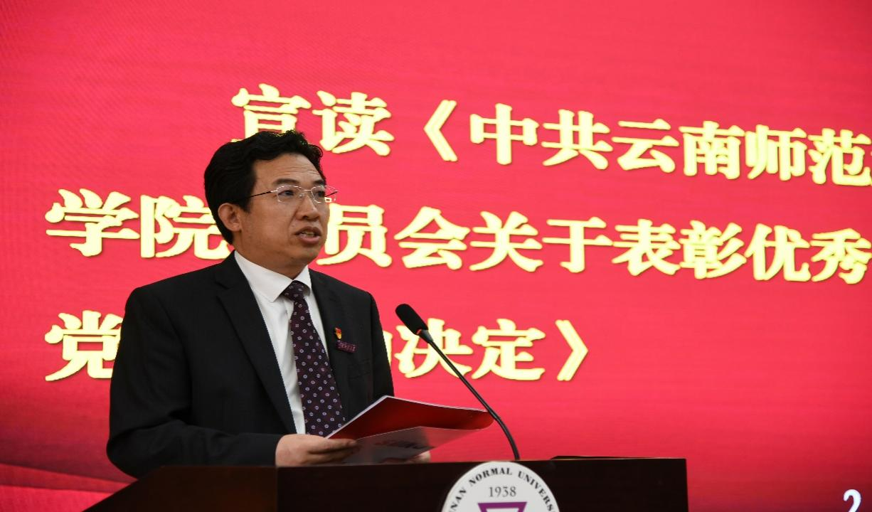 学院党委委员、学院院长王秀成同志宣读了《中共365英国上市官网在线云南华文学院、国际汉语教育学院委员会关于表彰优秀共产党员、优秀党务工作者、先进党支部的决定》。学院有1名党员被表彰为云南省学校优秀共产党员;有5名党员被表彰为学校优秀共产党员、1名党员被表彰为学校优秀党务工作者、2个党支部被表彰为学校先进基层党组织。学院党委表彰了10名优秀共产党员、2名优秀党务工作者、1个先进党支部。
