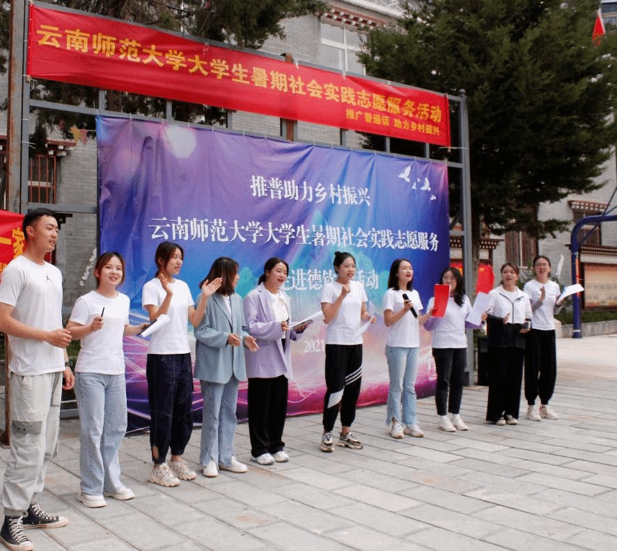 本次志愿服务团队由传媒学院播音主持专业负责人王建陵指导,语言传播系骨干教师谭辉协助带队,播音主持专业为主的12名优秀学生组成。根据德钦县教育局的统筹安排,志愿团队在升平镇敦和社区进行两场普通话诵读节目展演活动,并针对当地群众的普通话认知和运用水平进行了访谈及问卷调查。升平镇敦和社区、阿墩社区、阿东村、巨水村的数百名群众观看了诵读展演。