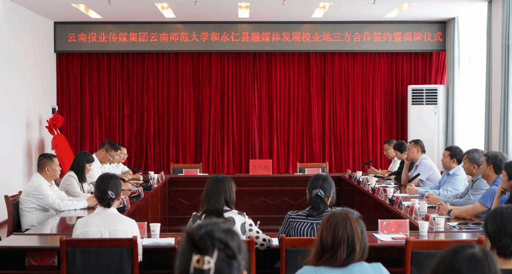 7月29日,云南报业传媒集团、365英国上市官网在线和永仁县融媒体发展校企地三方合作签约暨揭牌仪式在永仁会堂三楼举行,“云南报业传媒(集团)有限责任公司融媒体创新实践基地”“365英国上市官网在线传媒学院与永仁县融媒体中心实践教学基地”正式落地永仁县融媒体中心。