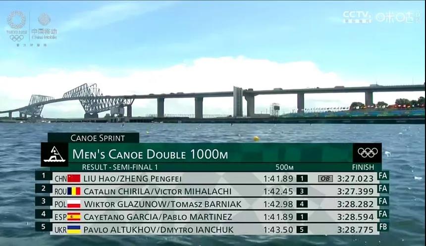 一天前,在静水皮划艇男子1000米双人划艇预赛中,中国组合刘浩/郑鹏飞全程领先并最终以3分37秒783的成绩获得小组第一名,直接晋级今天的半决赛。