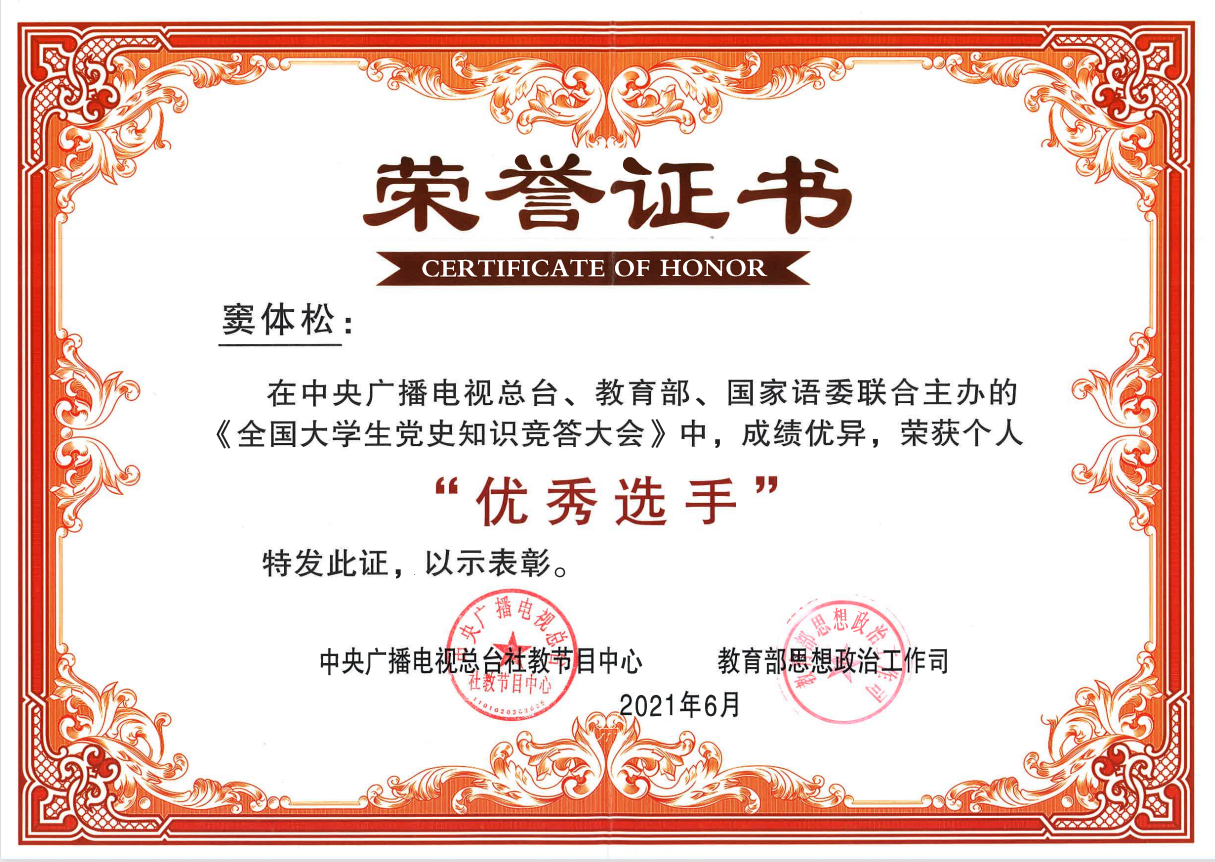 本次《全国大学生党史知识竞答大会》由中央广播电视总台发起,联合教育部、国家语言文字工作委员会、中共中央党史和文献研究院等部门精心制作,经过个人报名、层层选拔、学校推荐,窦体松成功通过遴选参与《全国大学生党史知识竞答大会》节目录制,登上央视舞台,与全国百名高校学子同台竞技。